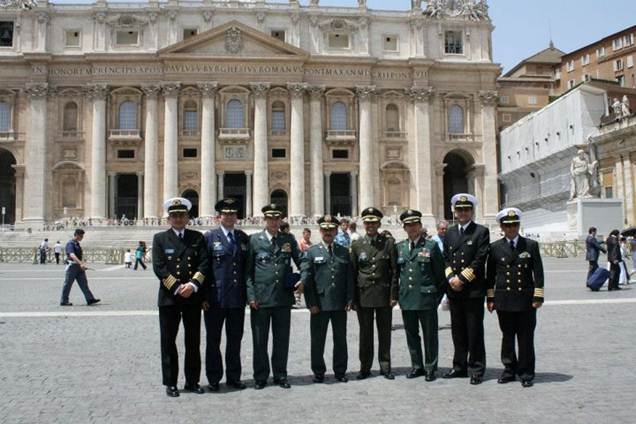 Los Capitanes de Navío Evelio Ramírez, Héctor Medina, Luis Hernán Espejo y algunos compañeros del CAEM con el Director de la Escuela Superior de Guerra en el Vaticano cuando asistían a la audiencia con el Papa.