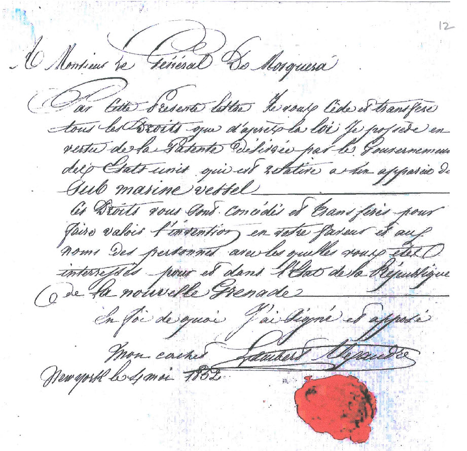 El General Mosquera en desarrollo de sus planes y para asegurar su éxito, solicitó al Gobierno de Colombia una Patente de Privilegio para poder exclusivamente introducir fabricar y usar este submarino en la Nueva Granada por un lapso de 12 años, lo cual fue aprobado por el Presidente de la Republica oficialmente el día 2 de noviembre de 1852.