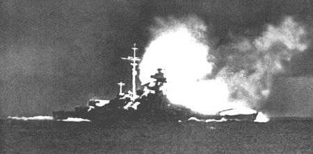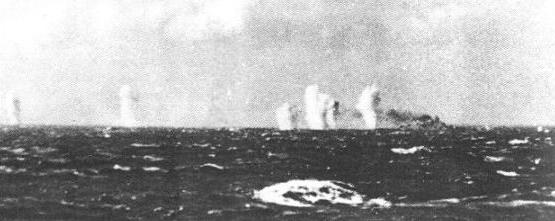 La última imagen del BISMARCK durante el combate final. El acorazado alemán, a la derecha de la imagen, navega a toda máquina entre los proyectiles británicos.