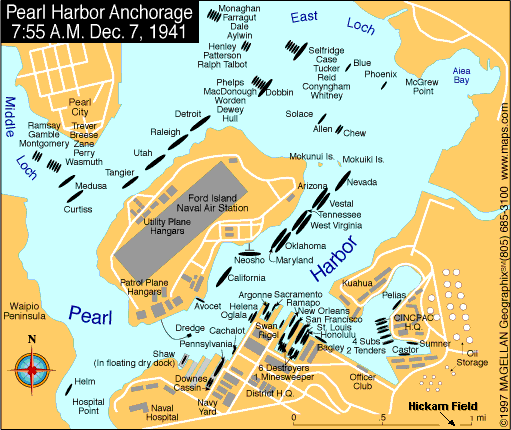 El texto es resumen de: "Grandes batallas de la Segunda Guerra Mundial"  2001 Ediciones Dolmen, S.L; del libro " ¡Tora Tora Tora! "  de Gordon W. Prange publicado por Reader´s Digest, 1974.  Departamento de la Defensa USA. 50.o Aniversario del comité conmemorativo de la guerra mundial II. Pearl Harbor: 50.o El Aniversario Chronicle Conmemorativo, "Una Nación Agradecida Recuerda" 1941-1991. Washington: El Comité, 1991.
